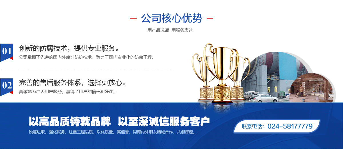 2004;GB/T28001-2011/OHSAS18001:2007;GB/T19001-2008/ISO9001:2008認證 體系,取得了化工防腐蝕施工資質等級一級單位,遼寧省腐蝕與防護學會防腐施工專業委員 會主任委員會主任委員單位,是中國石油撫順石油化工公司網內成員單位。幾年來本著“客 戶為尊、精益求精”的服務宗旨,服務于基礎設施、石油、化工、治金、化纖、能源、礦山、 核電站、海洋工程等眾多行業企業。 |